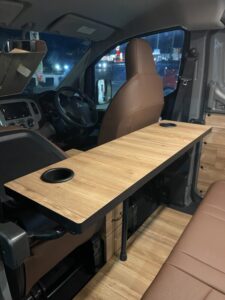 車中泊での食事やお仕事でのデスクワークなどに最適♪ 純正保護棒を利用して簡単に脱着可能なテーブルです。