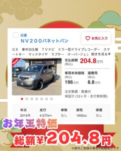 車両については、NV200バネットをはじめ、アウトドアや車中泊に人気のバン、仕事に使いやすい軽バンなど、初売り特価の特選車を多数ご用意。カスタムベースとしても魅力的な車両を厳選して展示していますので、実車を見ながらじっくりご相談いただけます。
