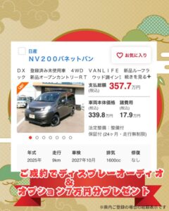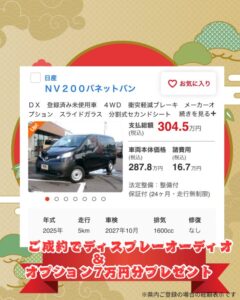 さらに、新車・未使用車をご成約のお客様には、オプション7万円分をプレゼント。ドライブレコーダーやETC、スタッドレスタイヤなど、実用性の高い装備をお得に追加できる初売りならではの特典です。NV200をベースにしたバンライフ仕様や車中泊カスタムを検討されている方にもおすすめです。(※メーカーオプションは対象外)