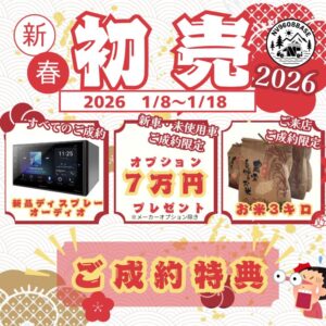 2026年のスタートを彩る「新春初売りフェア」を、1月8日から1月18日まで開催いたします。毎年ご好評をいただいている初売りイベントですが、今年もご成約特典・特選車ともに内容を充実させ、多くのお客様に喜んでいただけるフェアとなっています。